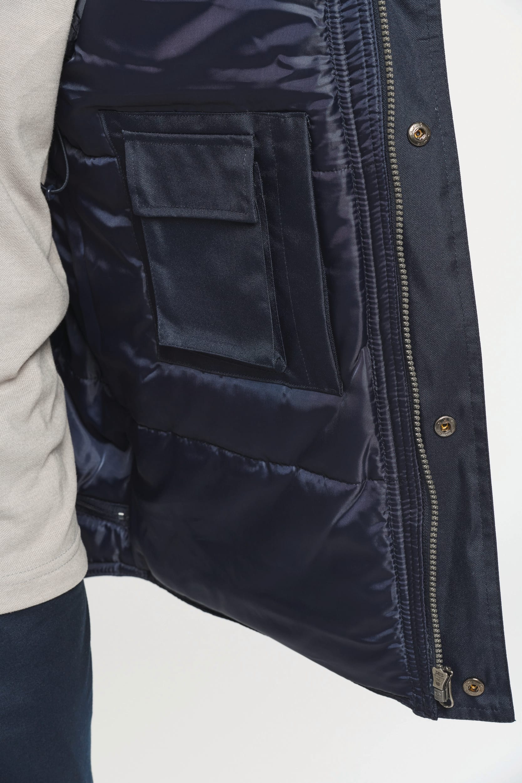 100 % polyester. Extérieur : 100% polyester Oxford avec enduction PVC. Doublure matelassée avec ouate 100% polyester. Fermeture zippée sous patte pressionnée. 4 poches extérieures (3 poches rabat |
